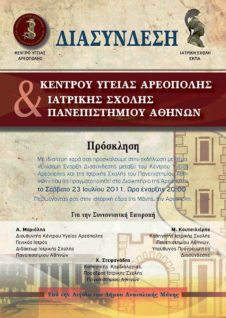 Το Κέντρο Υγείας Αρεόπολης και η Ιατρική Σχολή του Πανεπιστημίου Αθηνών διοργανώνουν Εκδήλωση με θέμα «Επίσημη Έναρξη Διασύνδεσης μεταξύ του Κέντρου Υγείας Αρεόπολης και της Ιατρικής Σχολής του Πανεπιστημίου Αθηνών».